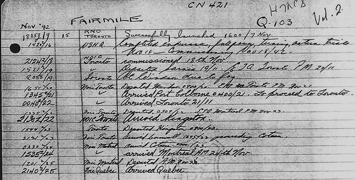 July 4, 1945, paid off at Quebec. Was towed to Sorel on the 7th, with Q098 and 100.